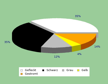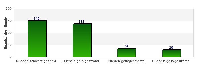 FarbstatistikUnsere Zucht spaltet sich auf zwischen gefleckt, grau und schwarz, sowie gelb und gestromt (nur bis 1980 gezüchtet). |