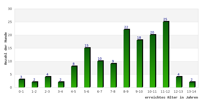 SterbestatistikVon mittlerweile 345 gezüchteten Doggen aus der Kühle-Grund-Dynastie sind mir 149 Sterbedaten bekannt. Und 89 meiner Hunde erfreuen sich gesund und munter des Lebens. Von diesen 238 Doggen erreichten bisher 107 das 8. Lebensjahr. Ihren 10. Geburtstag konnten sogar 53 Oldies feiern, was mich sehr glücklich macht. Ich hoffe,dass das restliche "Jungvolk" auch dieses hohe Alter erreichen wird.Von den übrigen 31% der Kühle-Grund-Doggen gibt es leider keine Infos/Unterlagen, da früher vor 30-40 Jahren auch Welpen mit "Handschlag" vom Hof gingen. Aber ich bin überzeugt, dass die restlichen unbekannten Daten so ähnlich aussehen. Unser Kühle-Grund-Durchschnittssterbe-Alter beträgt 8,3 Jahre->dies liegt mit 2 Jahen deutlich über den normalen Sterbealter anderer fremden Doggen. Stand: 29.12.2019